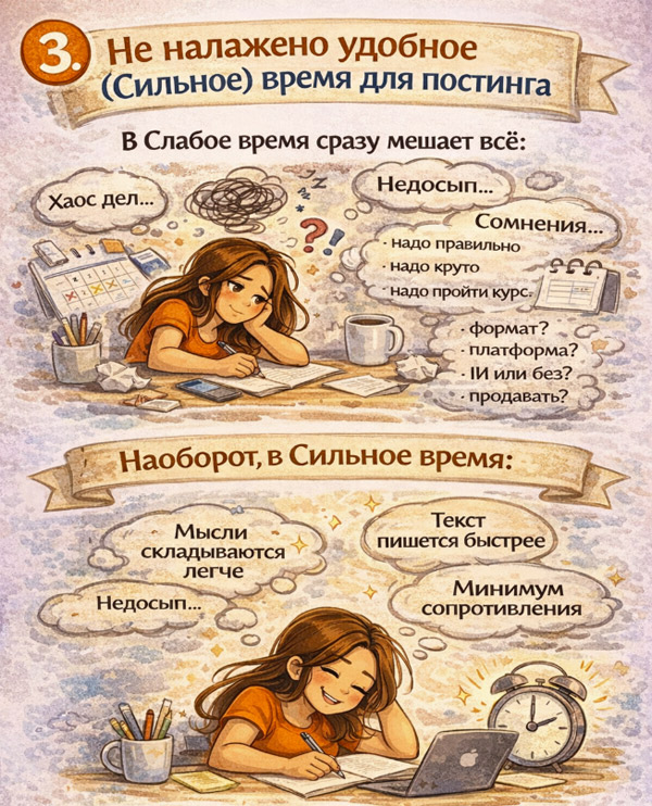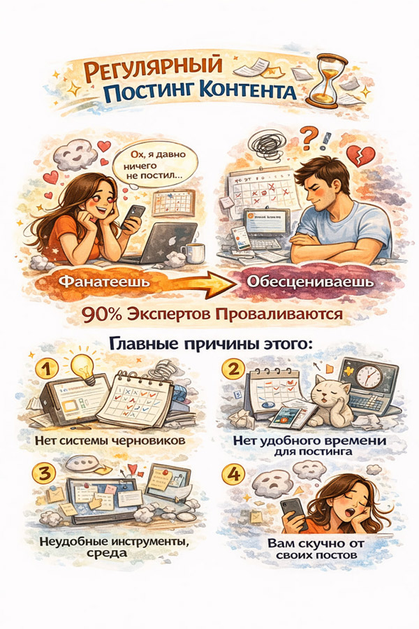 — Начинаю с базы — постинг контента. Почему некоторые никак не могут наладить регулярность публикации постов в соцсети, и что можно сделать (моя большая система, сама по себе тянет на мини-курс, выдам в коротких постах).