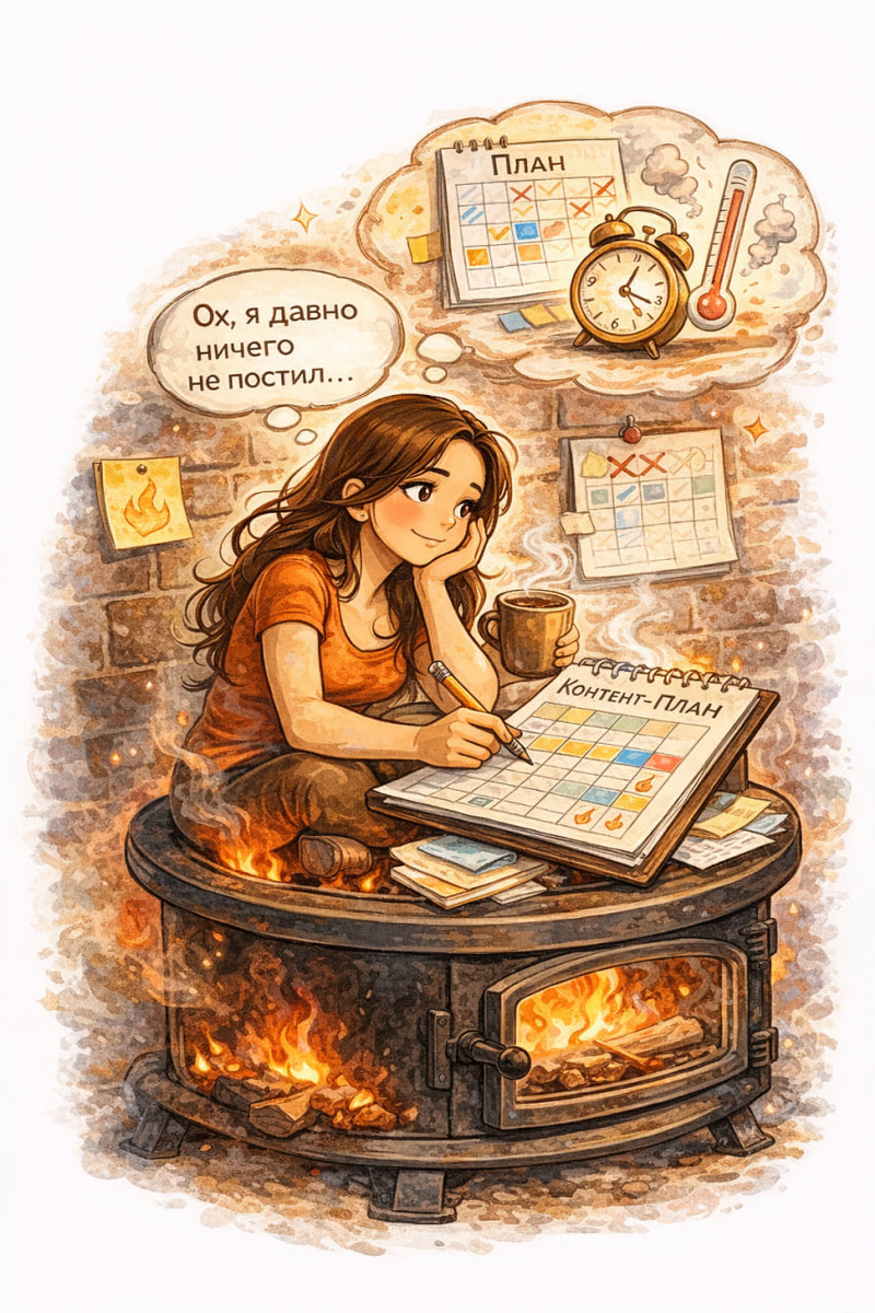 Я могу себе представить себя, которая пишет табличку контент-плана и поглядывает на часы, а ее медленно подогревают на печке (смотрите картинку ниже — это то, что у меня в голове).