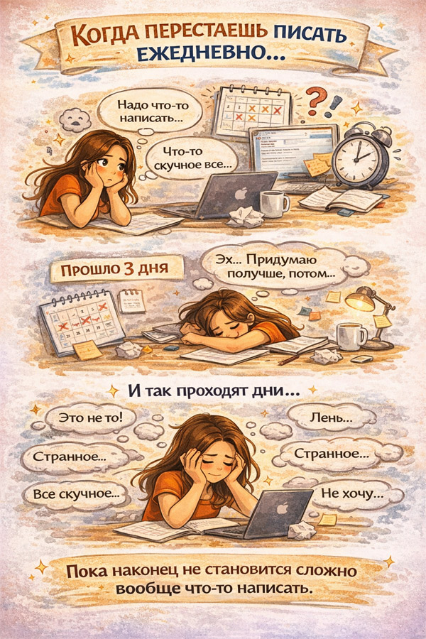 Я заметила (у себя и многих) такой эффект, что когда перестаешь писать ежедневно — потом выпадаешь дольше, чем на задуманные 2-3 дня, и очень сложно возвращаться.