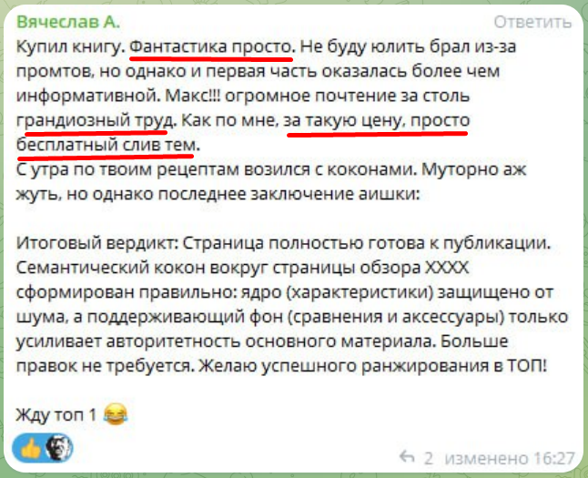 — Я старинный постоянный партнер Dr.Max и мы часто так делаем, много лет, если кто давно покупал SEO-учебники. Доверять можно 100%. Вы становитесь прямым покупателем от Dr.Max, вступаете в его чат для обсуждения SEO-тем из руководства и не только. Я вам ничего от себя не рассылаю, никак ваши данные не использую, только осуществляю продажи и консультирование по покупке.